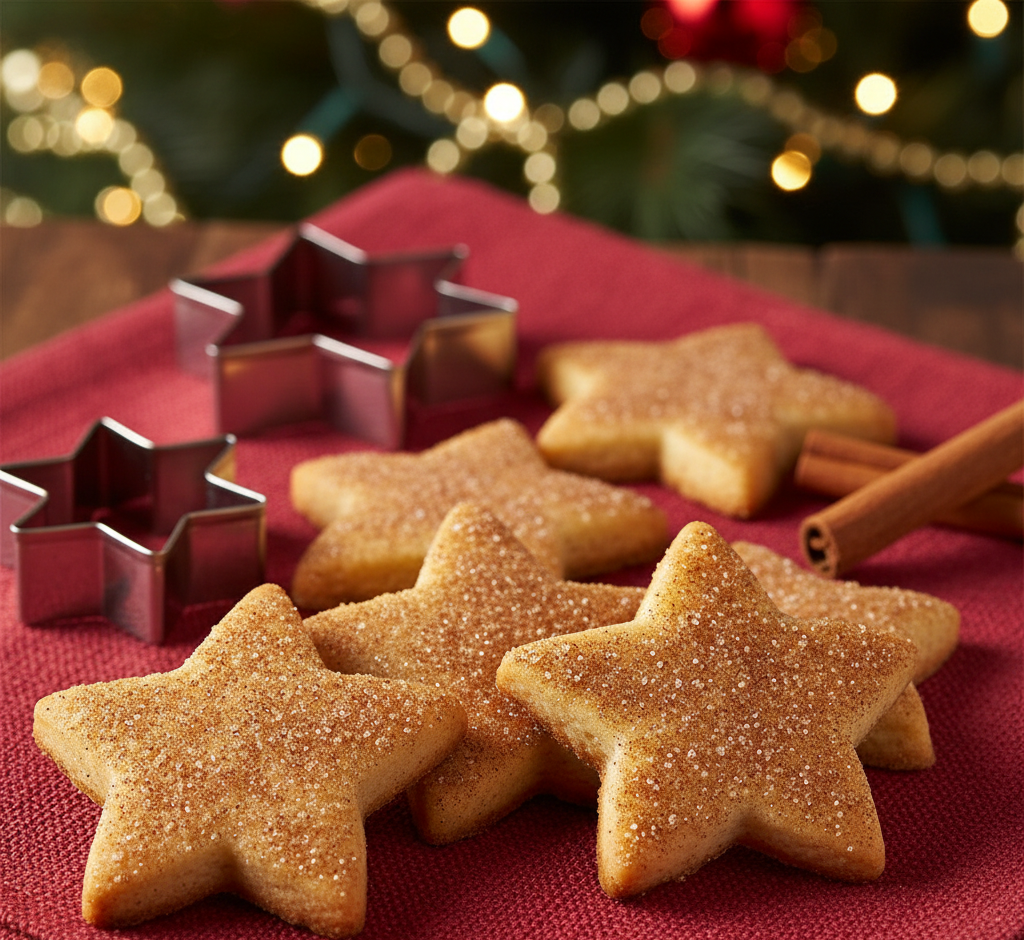 These are fun shaped sugar cookies coated in a sweet spice mix. You use star shaped cookie cutters. You brush the cookies with a little egg white. Then you sprinkle them heavily with cinnamon and sugar.