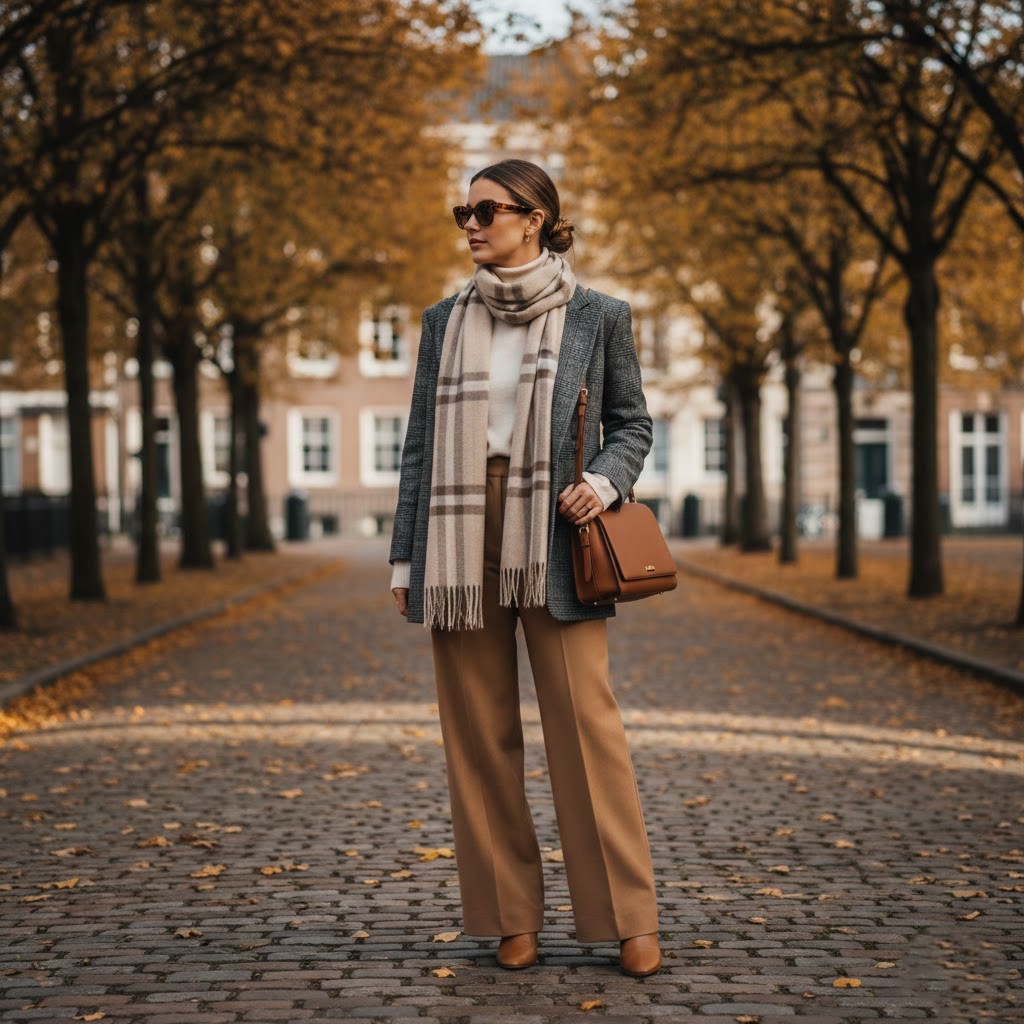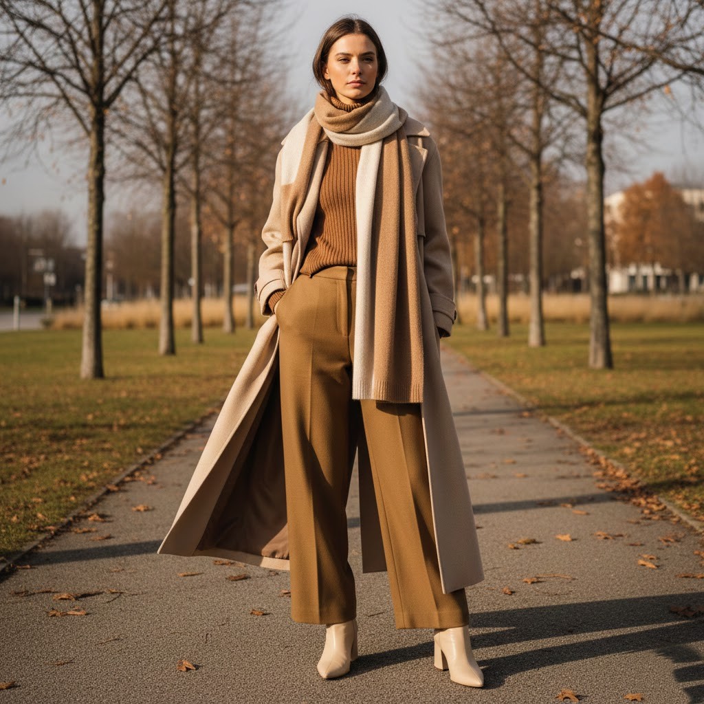 Using different textures keeps the outfit visually interesting without the need for vibrant patterns.