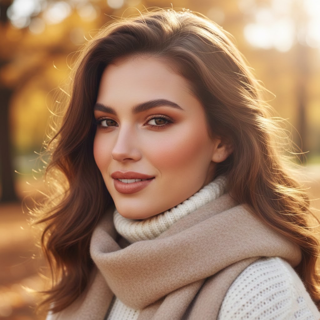 Using warm nudes on the lips, soft browns, and subtle blush are great complements to fall outfits and are much better than applying heavy or bright makeup.