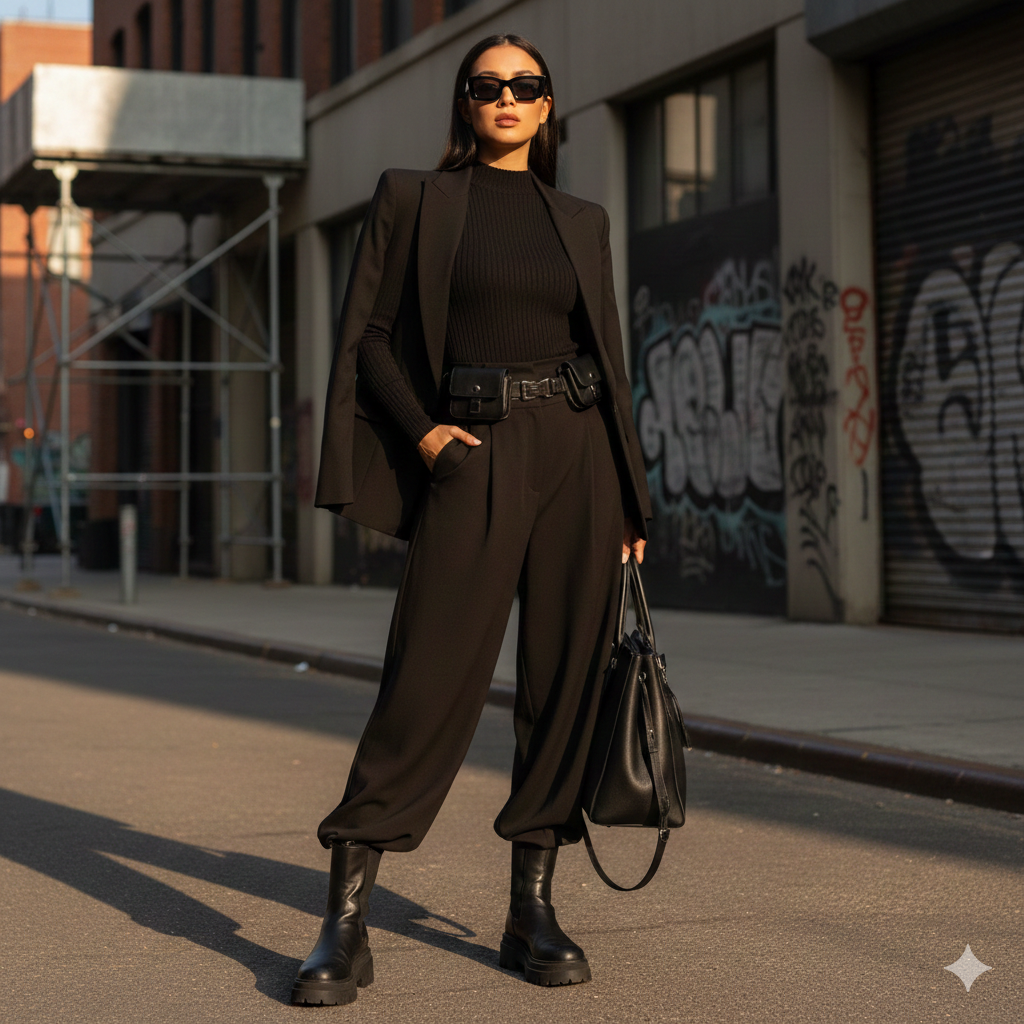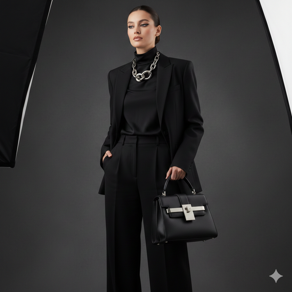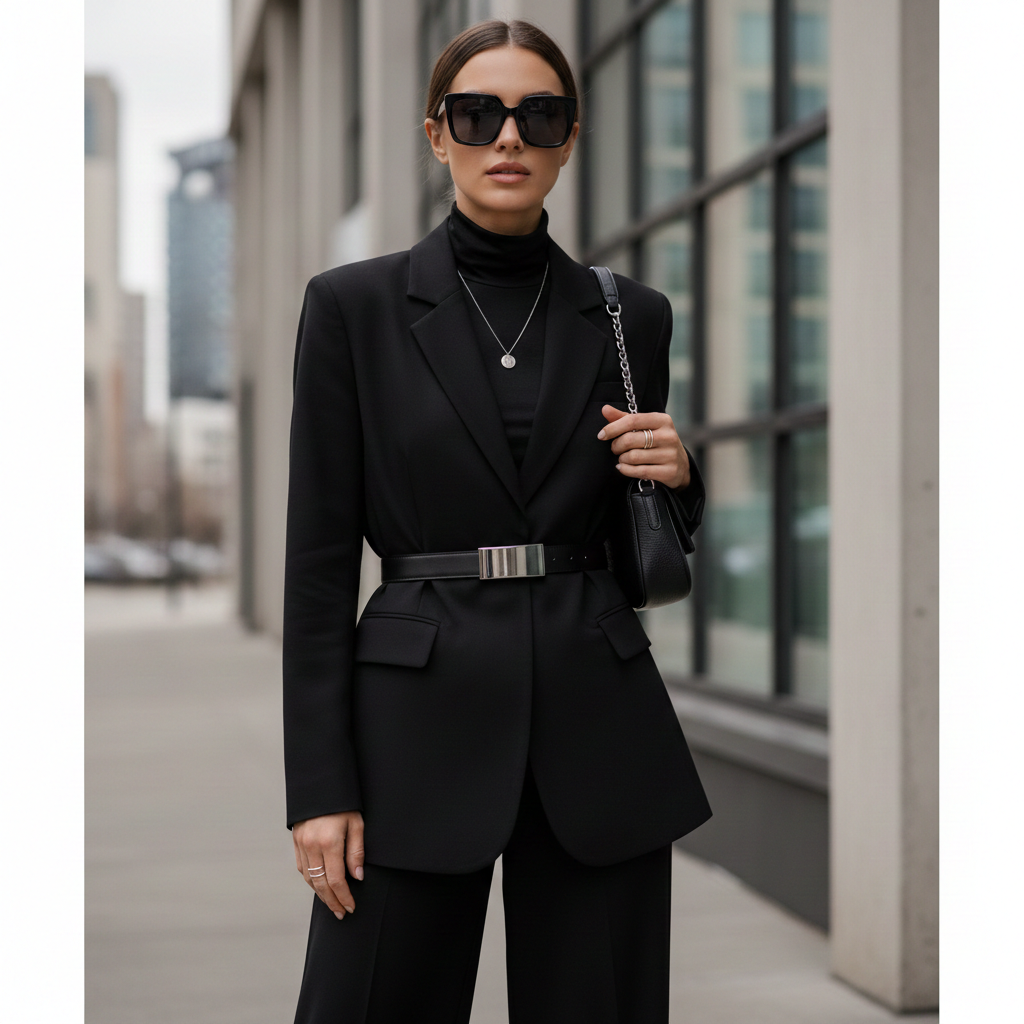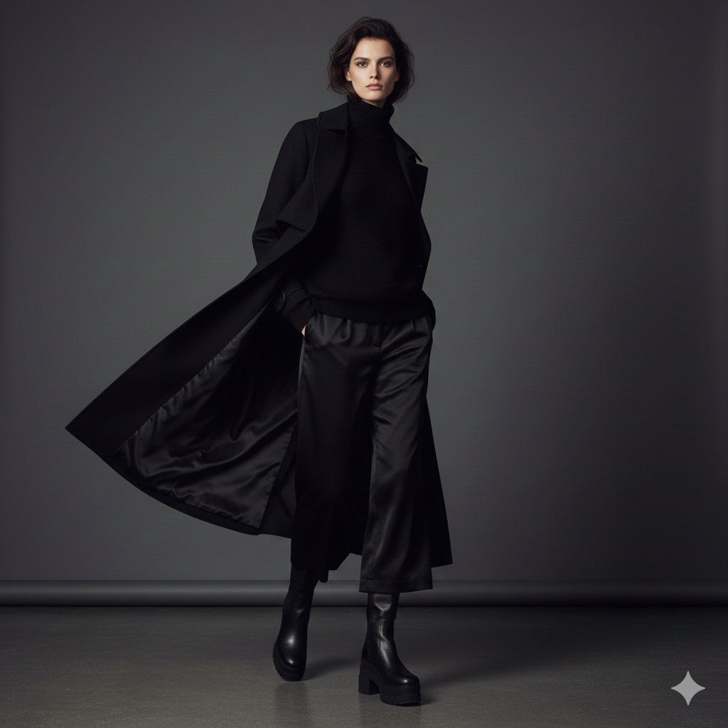 Other tiny elements, such as tonal stripes or silent embossing may provide some faint rhythm to the outfit and still maintain a neutral one. Because of these subtle clues, there is characterisation without sacrificing the all-black promise.