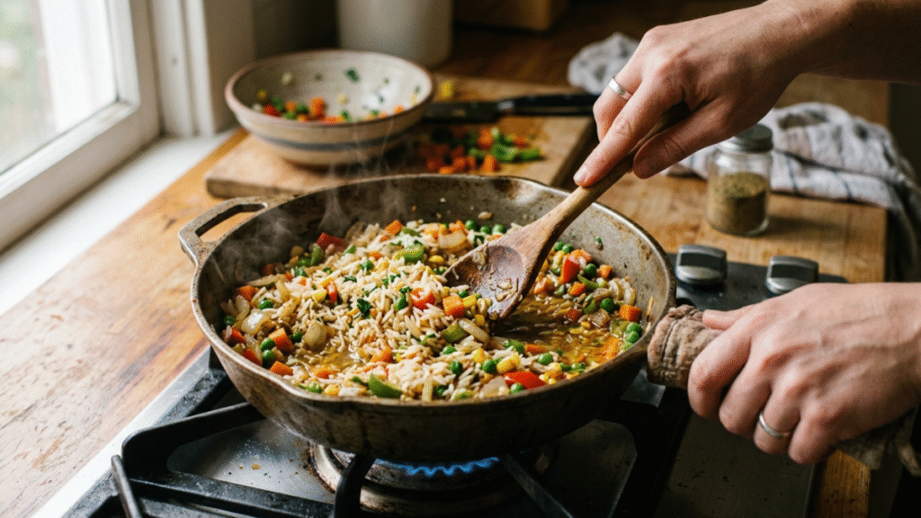 They made a simple vegetable rice with fresh ingredients that they had at the stall by boiling oil in a pan and adding chopped onions until it became soft, after which they added some garlic and some of the seasonal vegetables to give it flavor. Spices such as turmeric and salt were then added into rice and cooked with water until soft in a muted and filling meal and were reminiscent of simplicity and attention.
