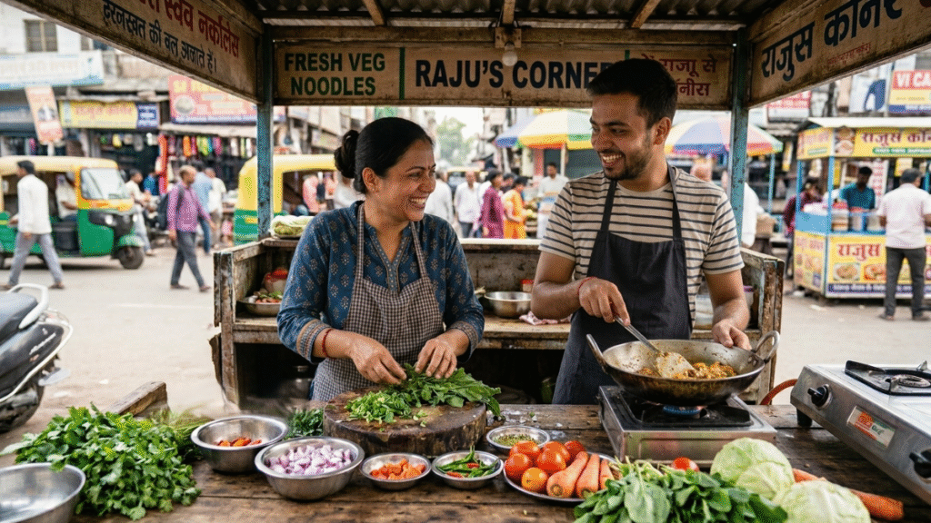 The owner of the stall asked them to come behind the counter and to make a simple homemade meal, and made it the activity of the moment. They decided to do it and the cooking together brought in a feeling of teamwork and happiness.