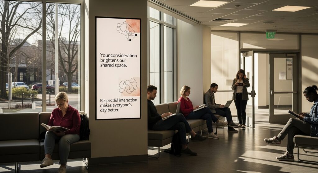 Companies are starting to work out the value of respect towards each other, both between customers and employees, and promote more cautious conduct in common areas. Reminders and awareness can be used to improve better habits.