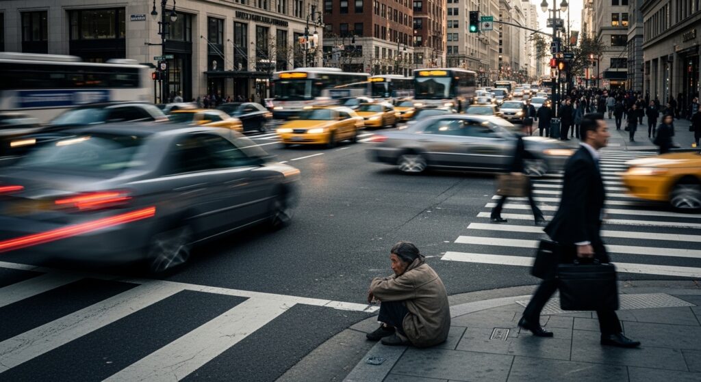 At a bustling intersection, a weakly looking man was sitting peacefully on the sidewalk requesting people to assist. His voice was not demanding, but rather patient and his eyes had an inwardness that promised a tale. He briefly looked at Arjun when he was reaching out to him. Arjun turned his head and walked more briskly instead of halting, assuring himself he had more urgent matters at hand.