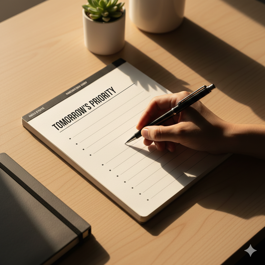 Very powerful individuals realize that the atmosphere of tomorrow is determined much earlier than the morning alarm sounds. They take advantage of the silent end of the day to cleanse their brain, tie up some loose ends, and gear up for a fresh beginning.
