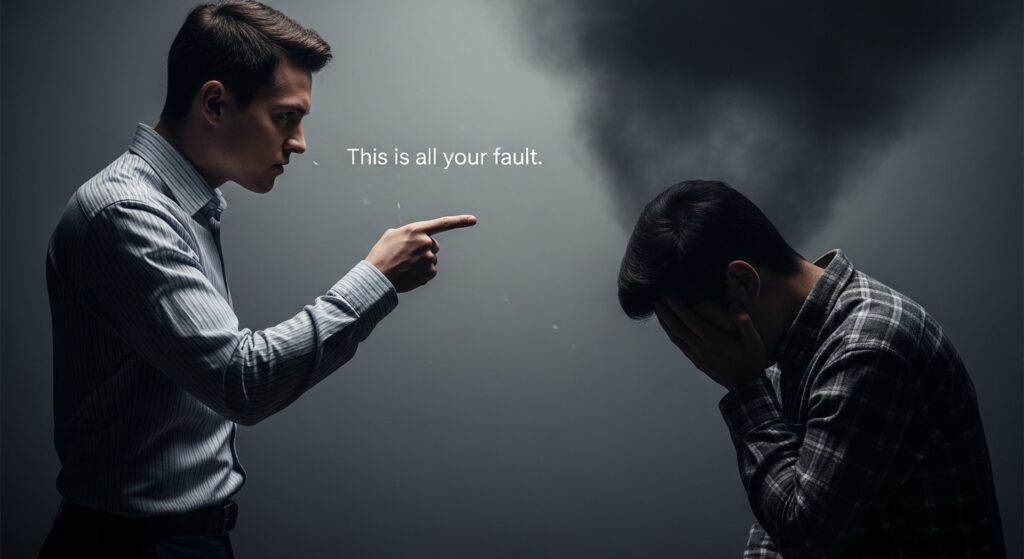 The blame aspect without mutual responsibility in most times points out to being unwilling to self evaluate or make errors. A healthy conflict must involve the two individuals assessing if they are right or wrong and failing to do so will result in an unbalanced type of conflict where one individual bears all the emotions of the conflict.