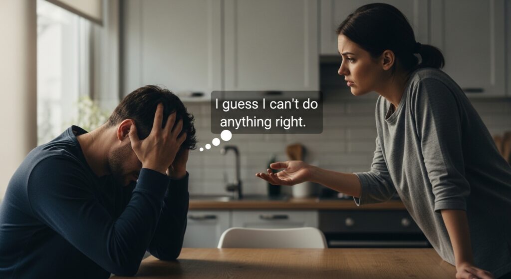 This is a self critical statement as it might be termed to be but it can give a refocus to the problem other than dwelling on his broken pride. Rather than dealing with the issue right out in it, it stresses you to console him and changes the discussion point to responsibility.