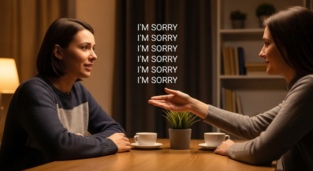 Over apologizing may be an indicator of a person who was taught at a young age that mistakes or nuisance were difficult to forgive. They could be held responsible to keep harmony even in cases where apology is not needed.