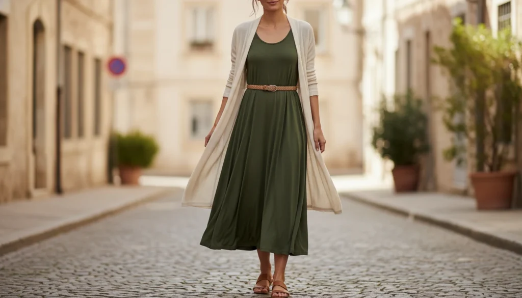 Black or olive jersey knits skim the body while allowing free movement. Layer with cardigans on cooler days or sandals in warmer weather. Add a waist-defining belt for shape.
