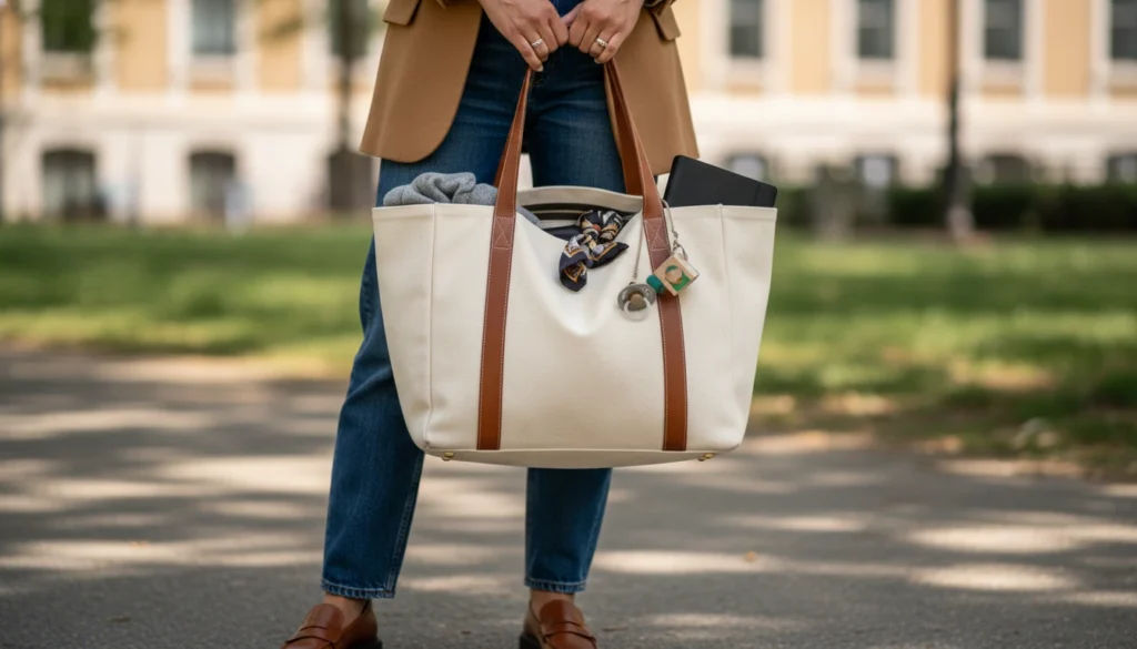 Neutral totes carry diapers, laptops, or groceries with organized interior pockets. Leather straps elevate casual outfits. It fits seamlessly into daily routines.