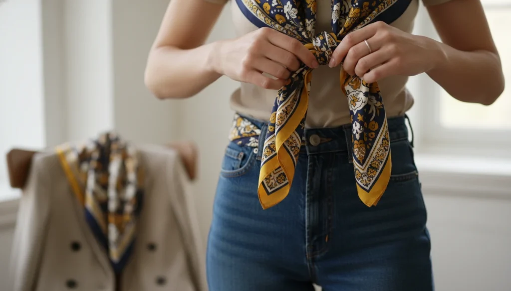 Square scarves work as headwraps, belts, or neck accents for instant personality. Lightweight fabric folds neatly into bags. Patterns refresh solid outfits instantly.