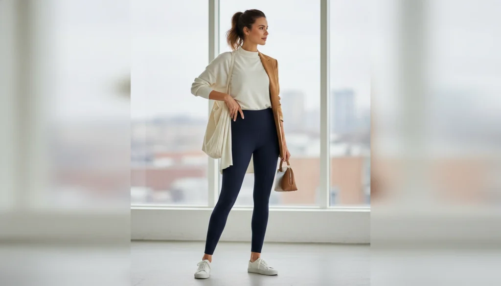 Dark or navy leggings pair easily with tunics, oversized sweaters, or sneakers for all-day wear. High compression supports without pinching during active hours. Add ballet flats and a blazer for a quick elevated look.