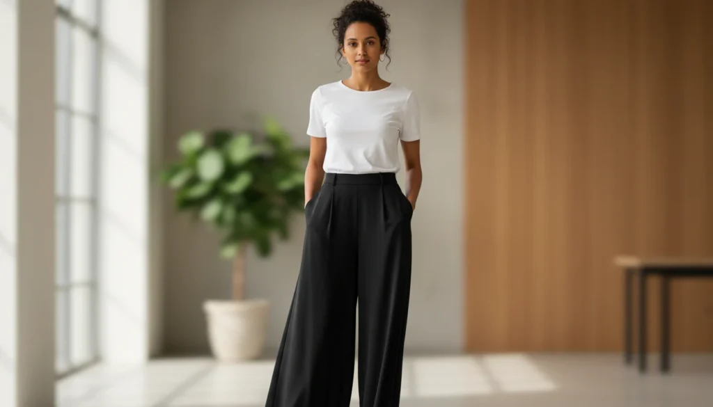 Black crepe or linen blends move easily from warm days to air-conditioned offices. Elastic waist options add comfort without gaping. Pair with fitted tops for balance.