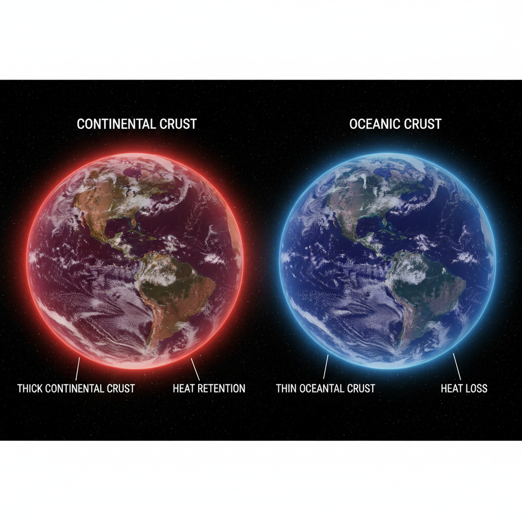 The ocean floor which is called the oceanic crust is much thinner than the landmass so it doesn’t insulate the heat very well. The vast cold water volume of the ocean pulls heat away from deeper layers more efficiently which makes oceanic regions lose heat faster over geologic time.
