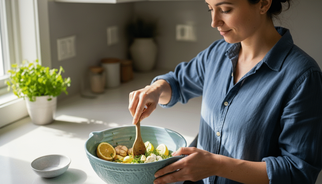 She then added olive oil, fresh lemon juice, minced garlic, salt, and pepper to a bowl and stirred the marinade until it was light and aromatic. Her spirits were raised at once by the new smell.