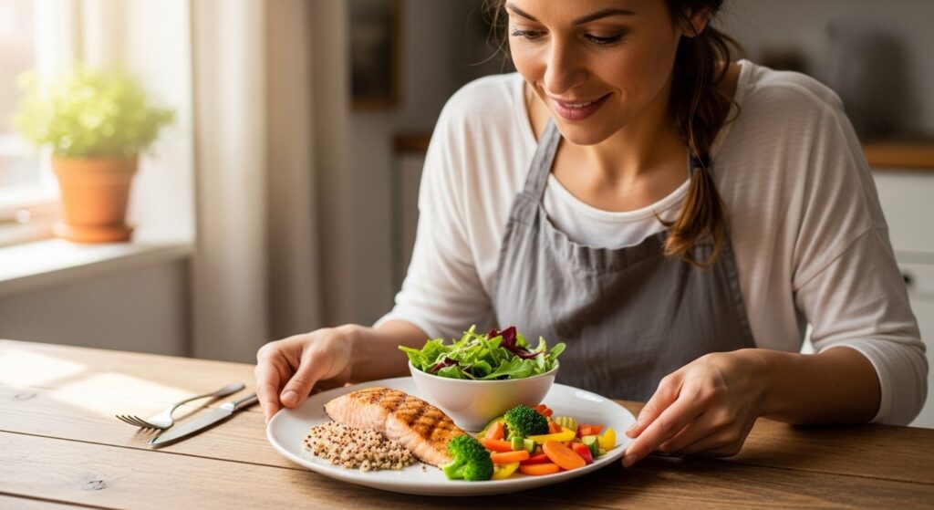 She combined the chicken with her basic meal such as the vegetables and rice making a balanced plate, which seemed wholesome and satisfying without the need to go out of her way.