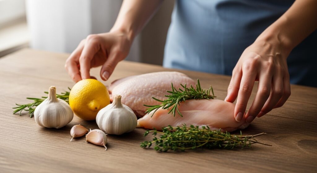 She took the simplest of ingredients such as chicken, garlic, lemon, olive oil, salt and pepper all of which were already available in her kitchen and needed no additional effort to locate. The mere simplicity was reassuring.