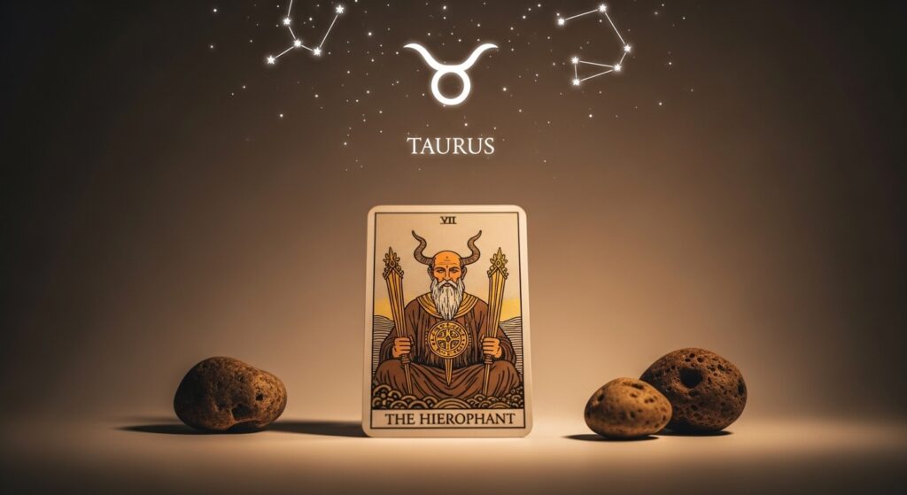 Taurus is strongly connected to stability, loyalty, and tradition, which aligns closely with The Hierophant tarot card. This card symbolizes spiritual guidance, values, and respect for established beliefs. People born under Taurus often appreciate meaningful traditions and steady routines that create a sense of security in life. The Hierophant reflects their grounded nature while encouraging them to trust their values and learn from collective wisdom.