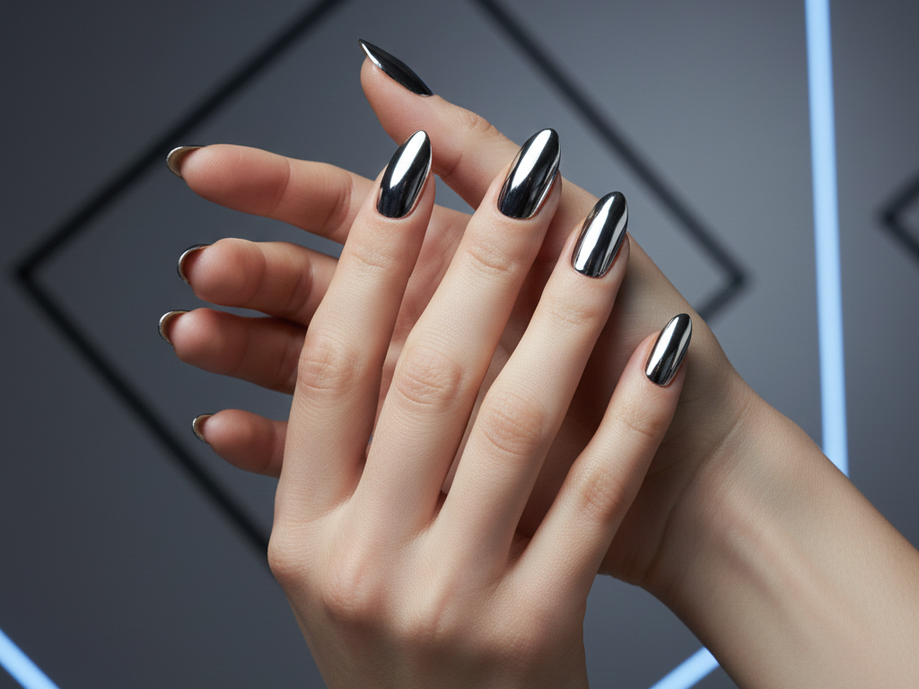 This super bright and shiny silver is a bold choice but it is totally in style right now because of all the celebrity influence we see. Getting this perfect iridescent sheen is easier if you use a chrome powder with gel but you can also find polishes that mimic the cool metallic look at home.