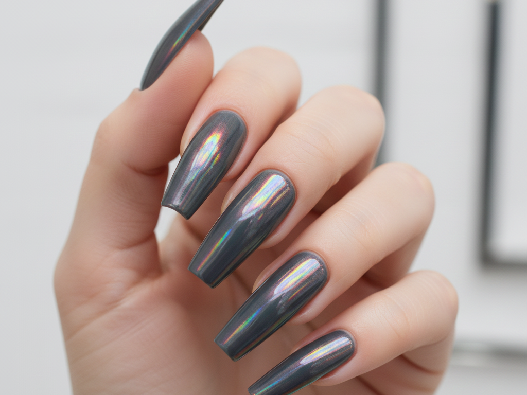 This near-black color looks really cool and futuristic right now. In the light, it has a fun, flashing rainbow shine. That holographic sparkle makes this color stand out a lot from everything else you see.