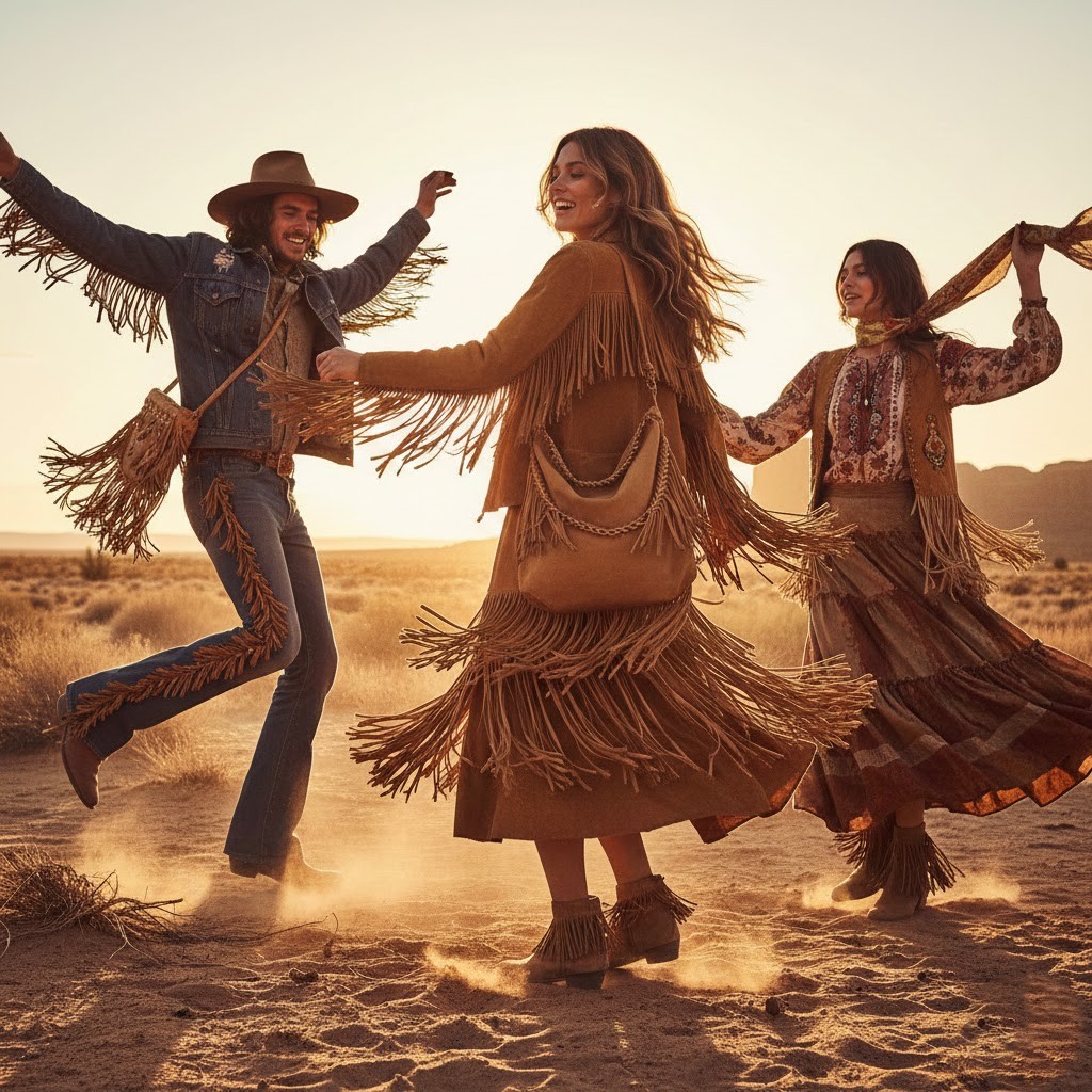 Jackets, bags and skirts had fringe, which gave the everyday clothes motion and texture. Fringe emerged as a notable ornament in the decad,e inspired by the western and folk style.