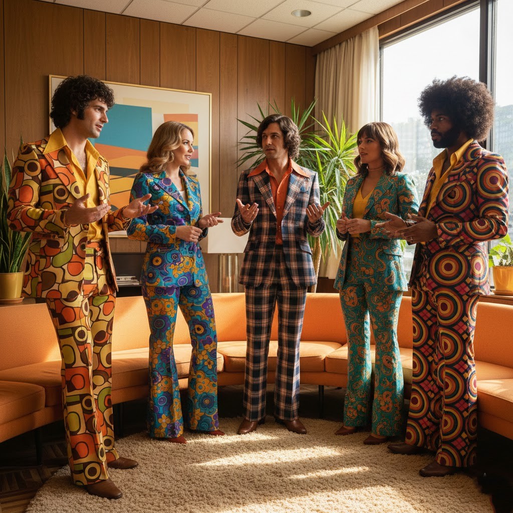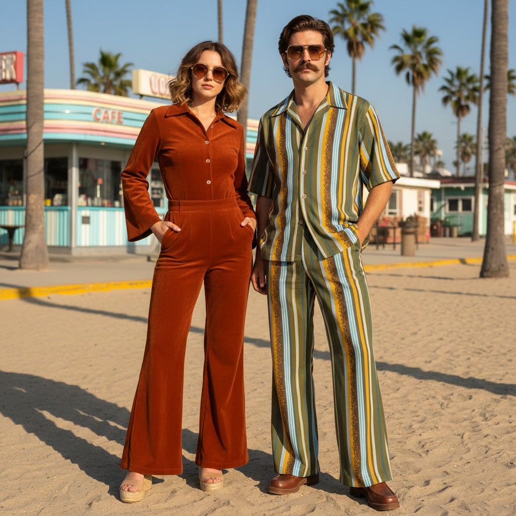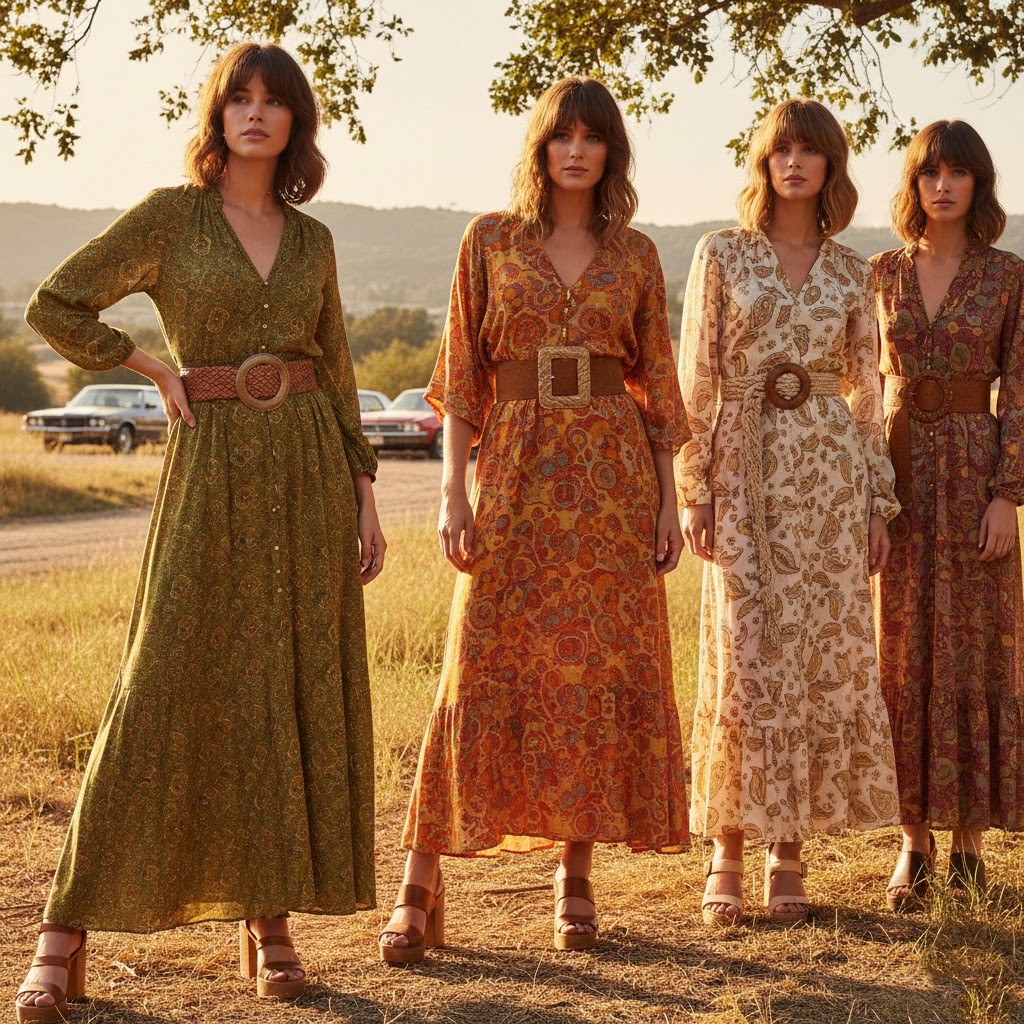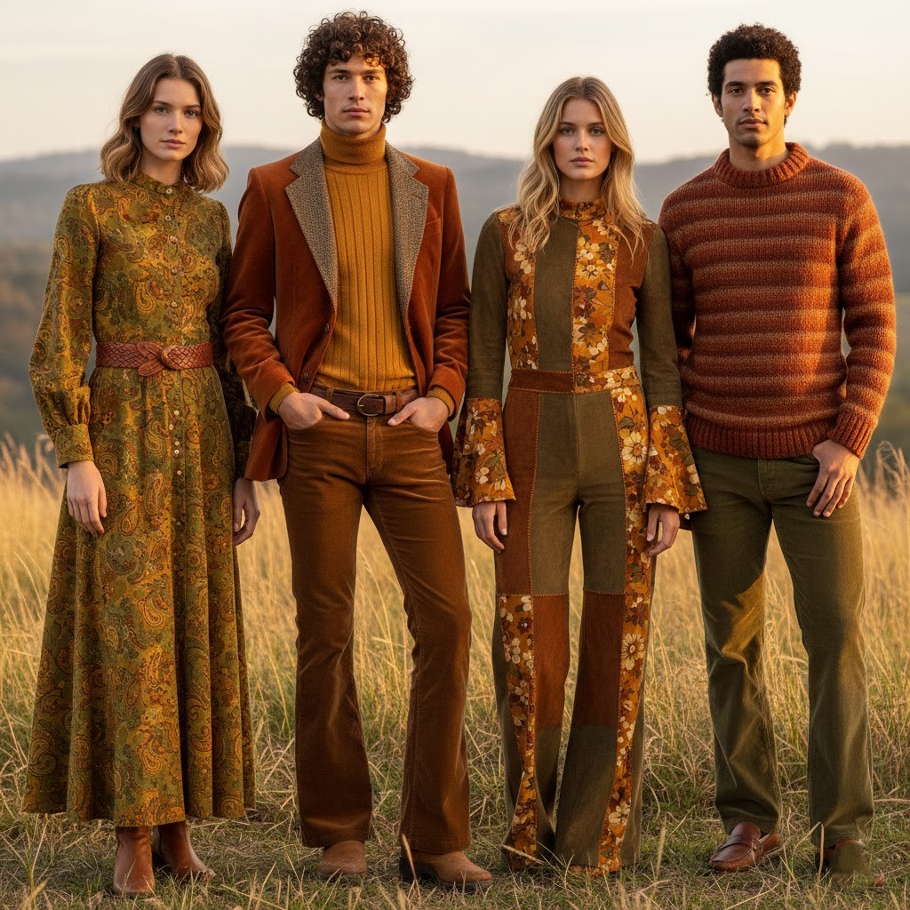 Brown, mustard, rust, and olive green colors became known as they were widespread and were treated in relation to nature and simplicity. These colours were manifested in the form of clothes, shoes and even accessories, giving the period a unified visual identity.