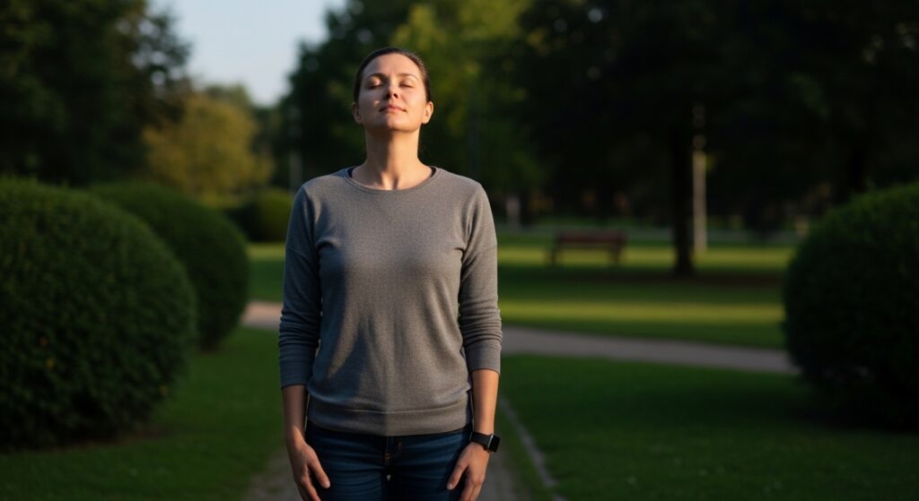 Technique involves using your body to control your mental loops. Your body will enter a state of protection when you relax your jaw and let your shoulders fall because your nervous system recognizes active safety.